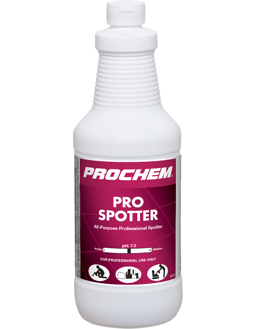 Pro Spotter is a ready-to-use all-purpose water-based spotting agent specifically formulated for safety and ease of use, and can be used on almost all synthetic and natural fiber carpets, area rugs, upholstery, and fine fabrics. The potent cleaning ingredients remove a wide variety of common spots and spills found in residential and commercial cleaning environments.