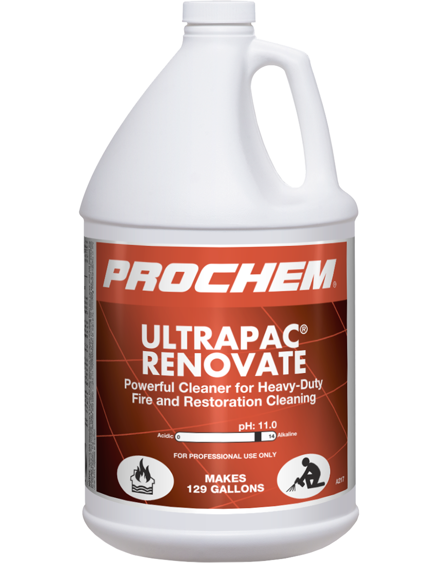 Formulated for the most difficult fire or water damage restoration jobs, Ultrapac Renovate is a highly concentrated extreme cleaner for heavy soils and charged particle soils such as soot contamination. This cationic cleaning agent can be used on most painted and unpainted surfaces, drywall, metals and other water-cleanable surfaces. Renovate contains no solvents that can damage sensitive surfaces and easily rinses without streaking.
